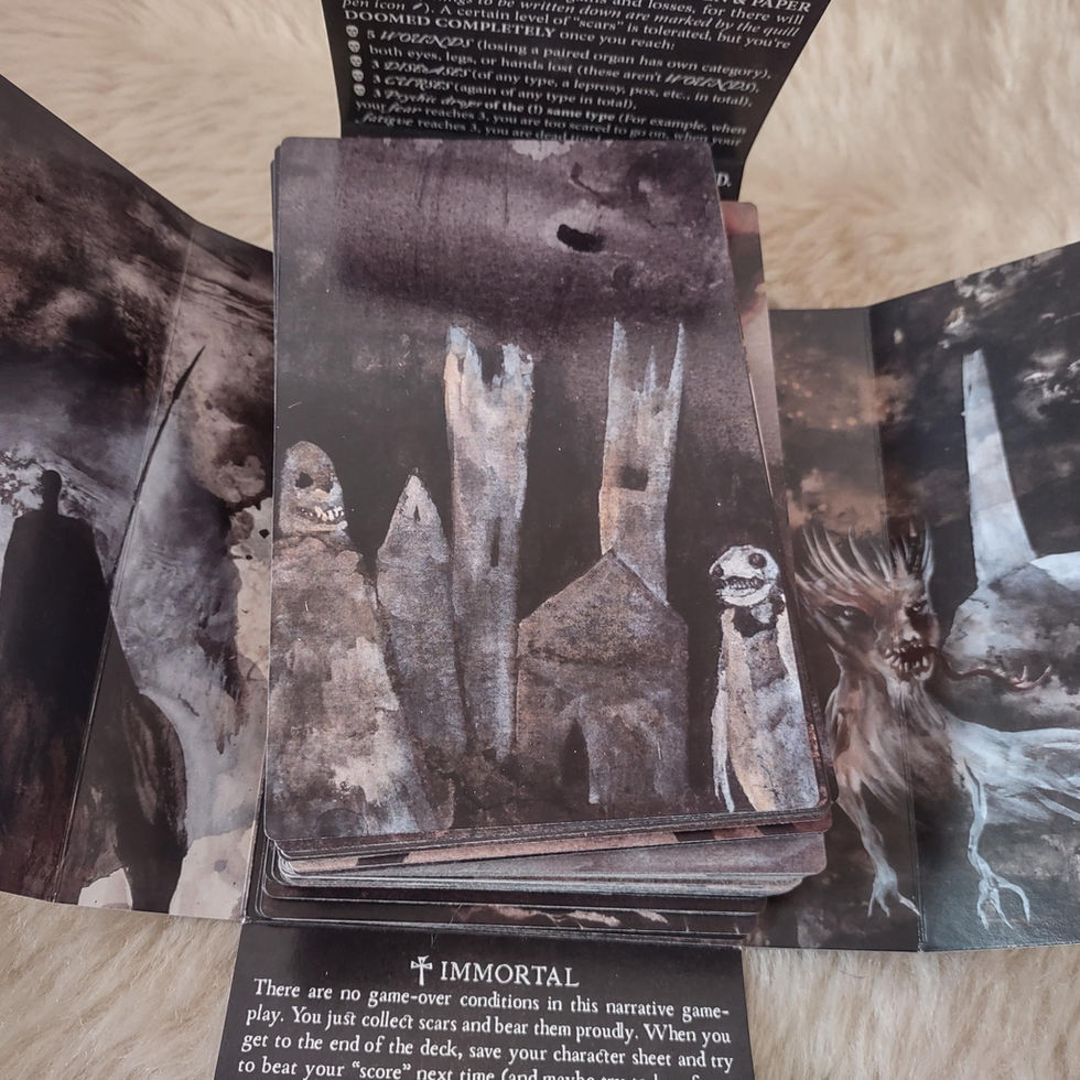 On every turn, you take 3 cards from the top of the deck that represents your future. From the three cards, just based on the images, you choose one path to reject, one path to postpone, and one path to go. The path you have taken is then revealed - you turn the card, read the story, make some decisions according to the text and apply the eventual changes, losses, or gains to your character sheet or just a piece of paper. This way you build your fate of a medieval pilgrim-hero and you try to survive the whole journey to the bottom of the "your future" deck. There are fights, NPCs, equipment, and many more... just as in a gamebook (a very grim & dark one, full of odd meetings) but there is no dice rolling, everything depends on your decisions and on the path you had gone before. For the next play, you will possibly remember what image hides what kind of event or fight, so you may choose your path wiser, according to your current equipment, and fitness. But there are always mortal dangers lurking in dark corners of this corrupt god-abandoned world, eager to put doom on you!