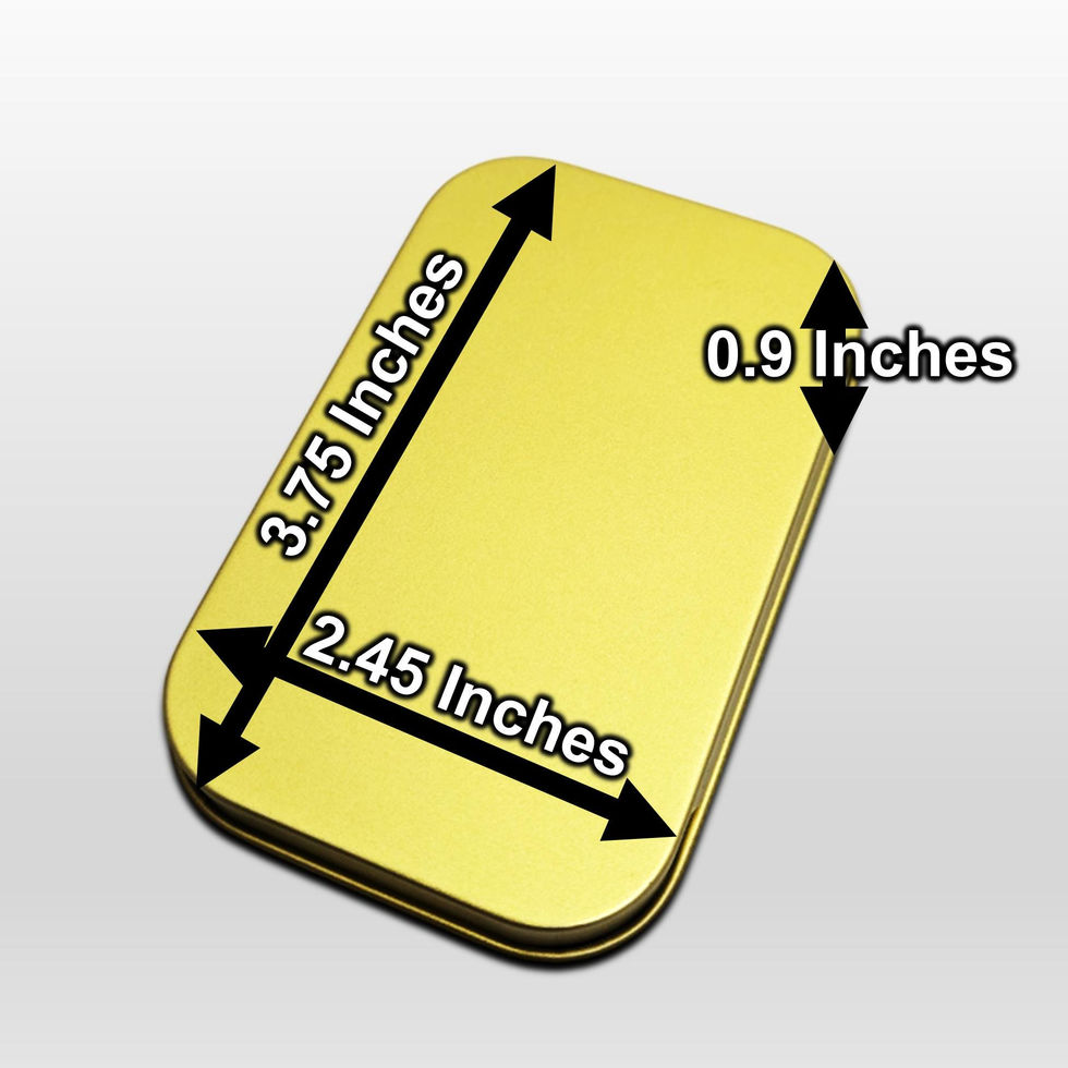 A hinged, seamless steel, Gold color tin great for storing trinkets, mints, buttons, matches, candy, games and much more! Comparable size to an Altoids tin.