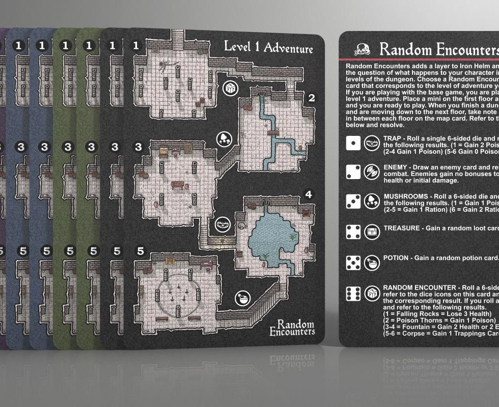 Random Encounters This includes four double-sided jumbo map cards to track what level of the dungeon you are on. Also included are three minis (Male Ranger, Female Warrior, and Male Wizard) to use to track your position. Random Encounters adds a new mechanic where your hero enoucnters something in between each level of the dungeon. Symbols on the map cards indicate what the player will run into. Maybe Bolda trap, or some mushrooms, or a nasty foe lurking in the shadows...